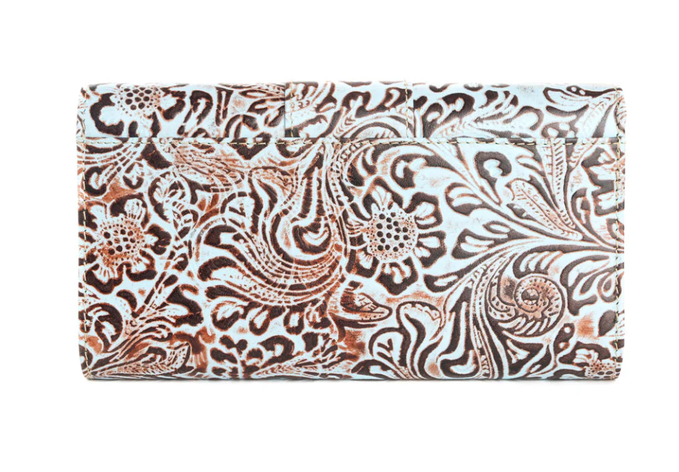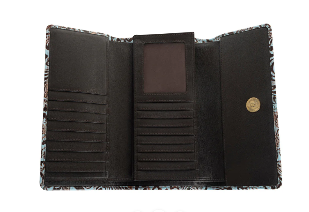 Discover amazing style and design in this wallet, a wonderful blend of Southwestern allure and practical elegance. The exterior showcases a mesmerizing turquoise and copper brown embossed floral design, secured by a stylish brass ring. Inside, rich black leather offers ample card slots and a convenient ID window. This versatile accessory seamlessly complements both casual and dressy outfits, keeping you organized in style. Snaps closed.
