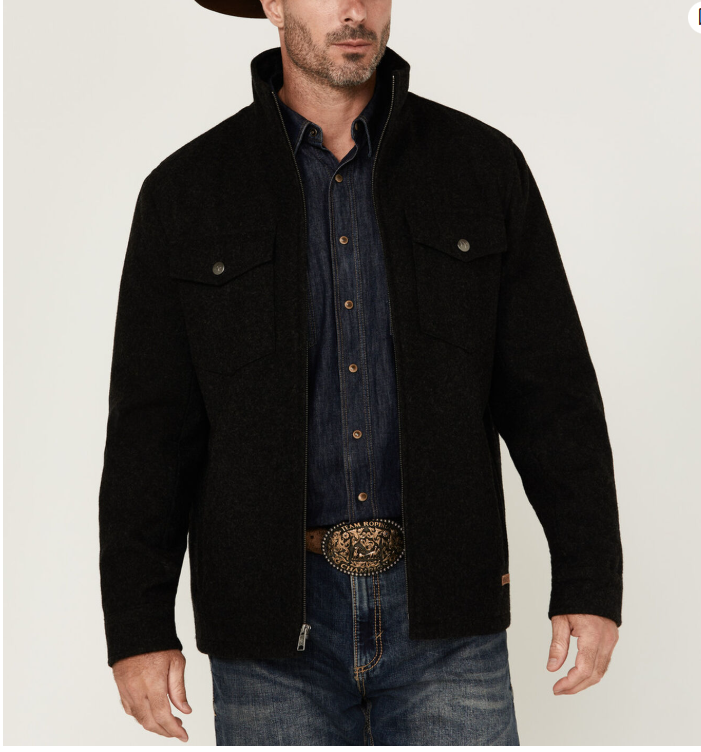 Model is 6'2" wearing a size largeShell: 80% wool / 20% polyester ; Lining: 100% polyesterStand-up collarLong sleevesFull front zip closureTwo single-point flap pockets on chest with snap closuresTwo welt hand warmer pockets with zip closuresHeather black designLinedImported?