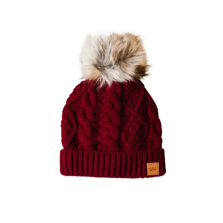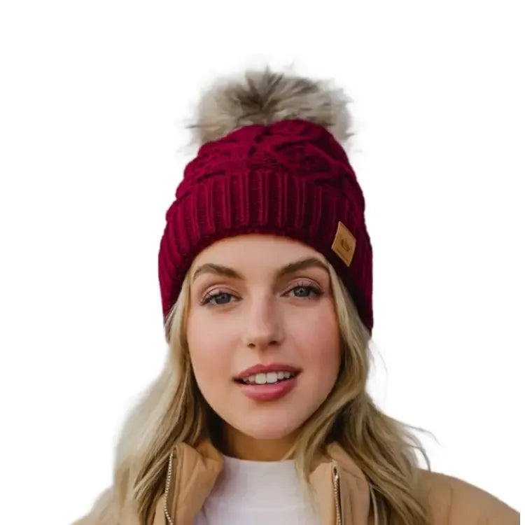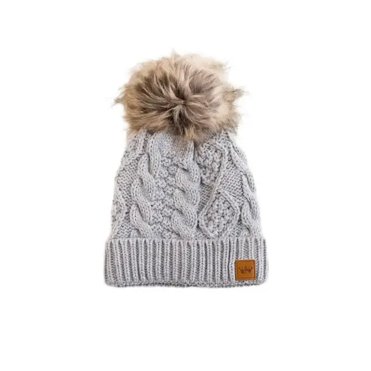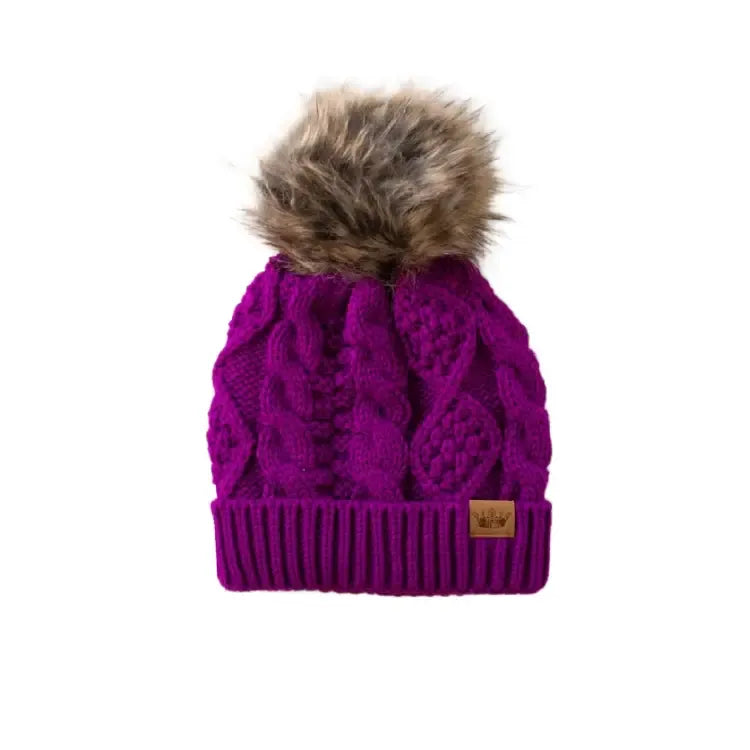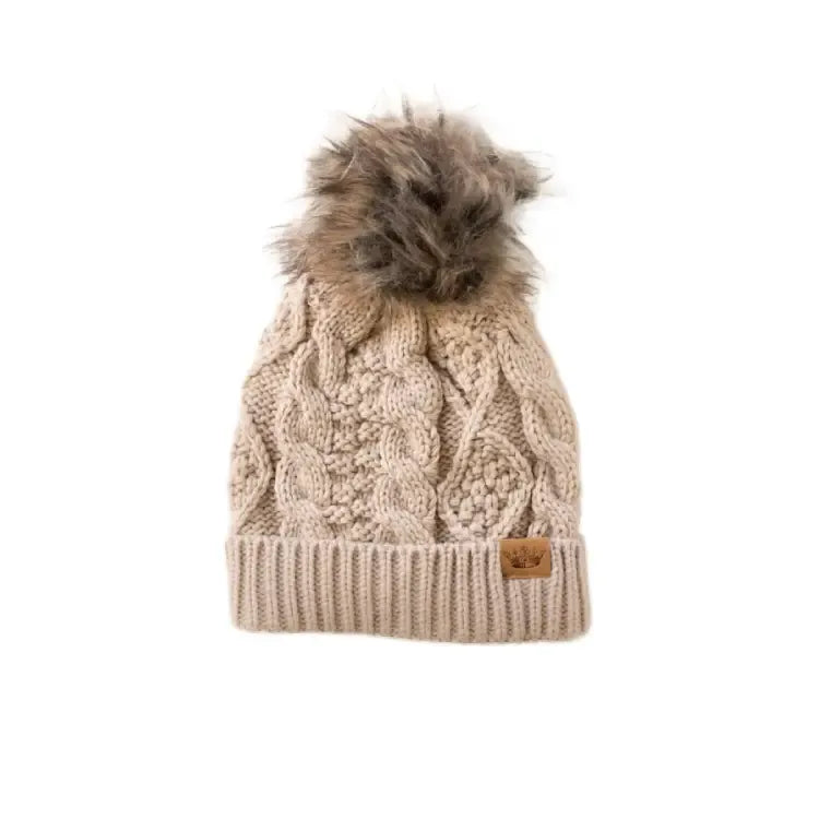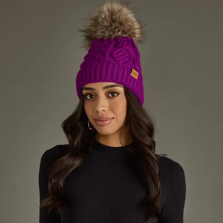 Stay warm and stylish with the PANACHE Cable Knit Pom Hat, featuring a classic cable knit design topped with a luxurious natural faux fur pom. The cozy fleece lining provides extra comfort during cold weather, while the signature crown patch adds a touch of personality. Crafted from 100% acrylic for durability and easy care, this one-size-fits-most hat is the perfect accessory for any winter wardrobe.