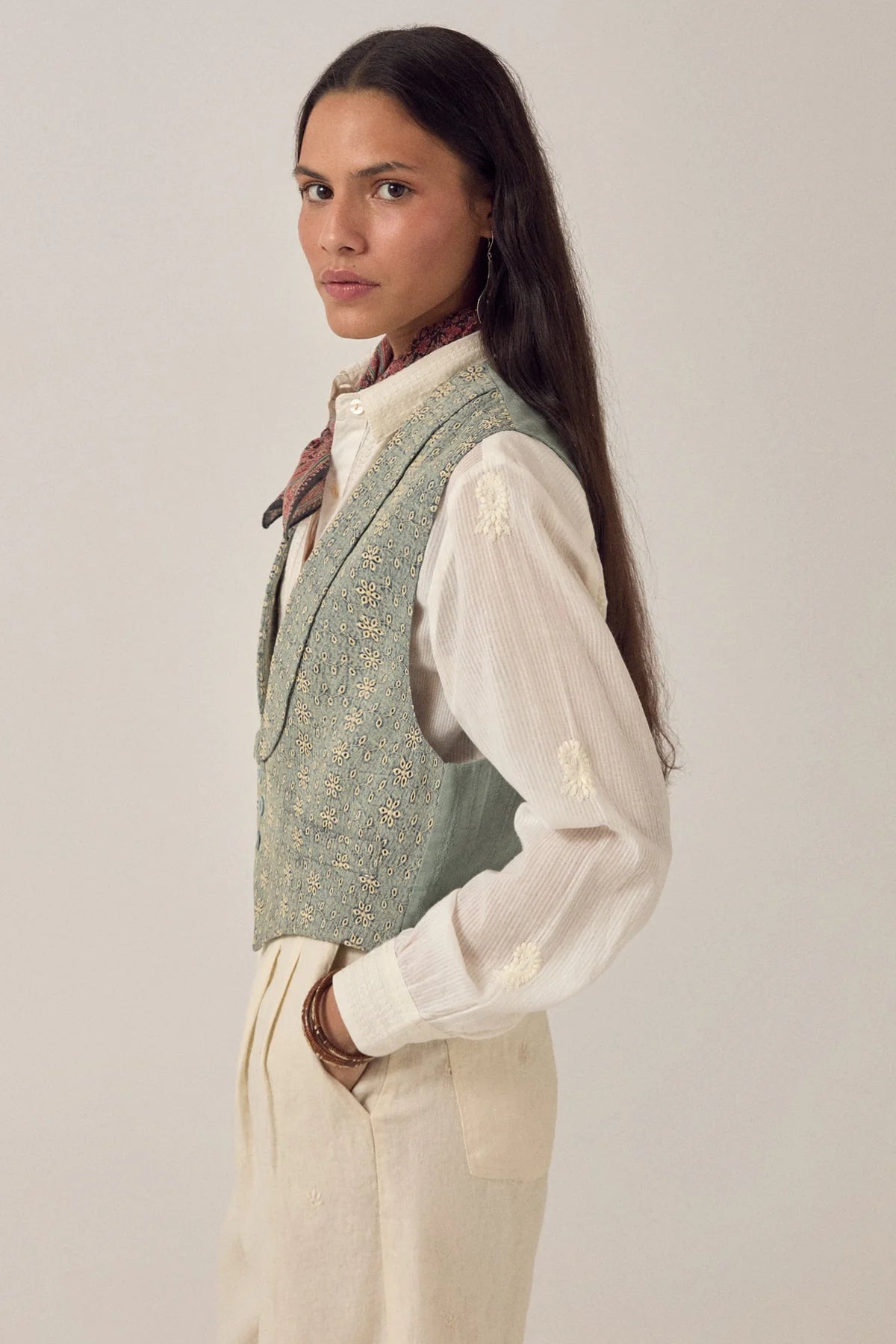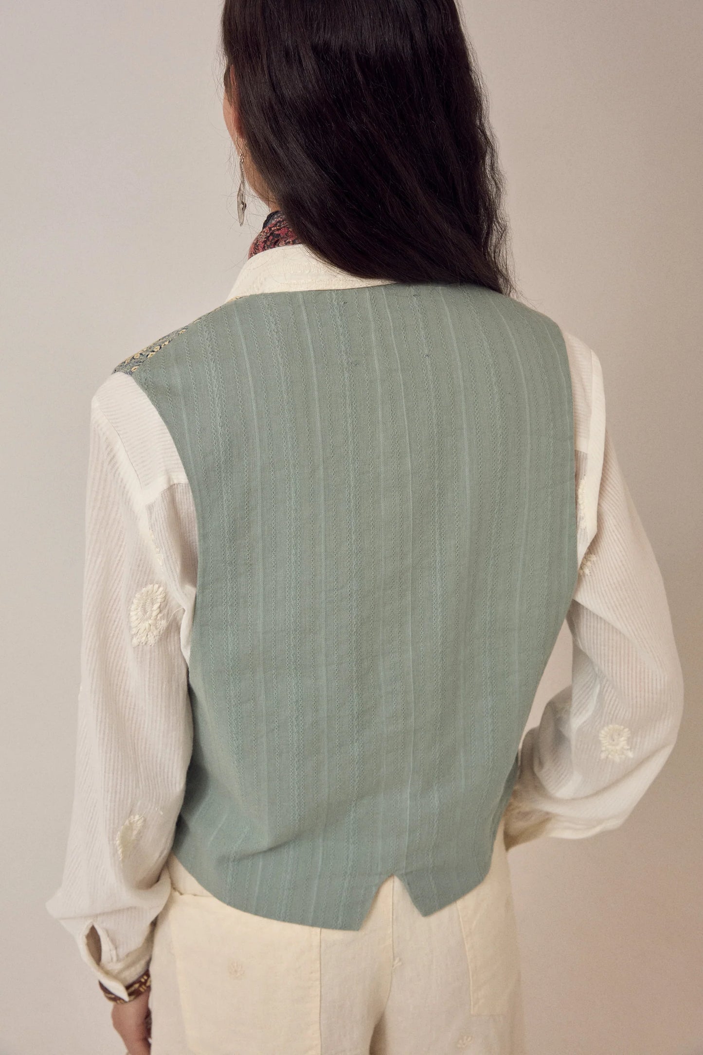 A refined masculine-cut vest in structured cotton twill, built on the same proven construction as their Shell style. The V-neck frames wide, dramatic lapels while three metal buttons and dual waist pockets provide both detail and function. Intricate embroidered eyelet work adorns the entire piece, anchored by tailored shoulders that hold their shape. Cerulean captures that coveted sun-bleached aesthetic—a pale blue that drifts toward white, reminiscent of well-worn denim. The same eyelet embroidery and crisp cotton twill construction ensure consistency across the design. Those generous lapels transition seamlessly over printed blouses, minimal dresses, or layered basics. Style it solo or pair with the matching Theodore pant. The fitted silhouette is engineered to complement looser layers underneath, making it a versatile anchor piece for any wardrobe.