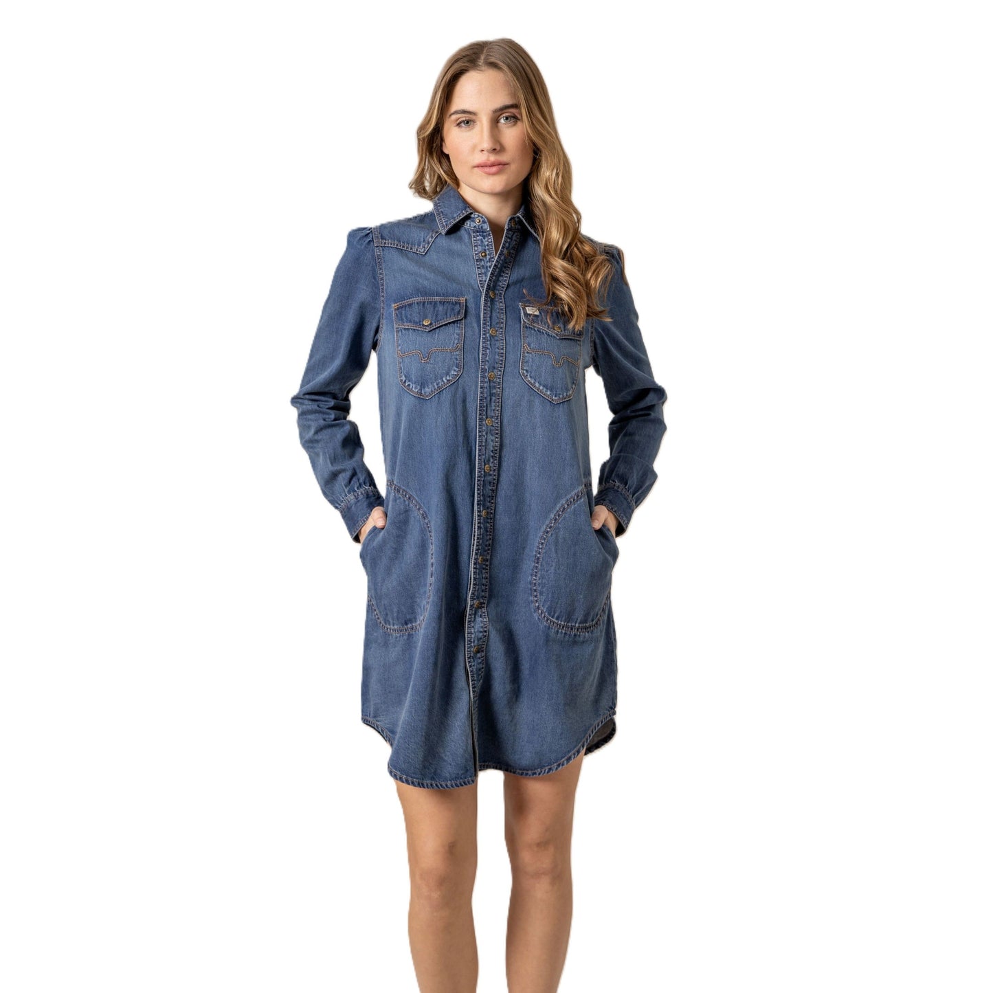 Introducing the KIMES RANCH Rox Dress, perfect for those who appreciate a western-inspired look. this dress exudes elegance with a touch of western flair. Embrace the style of the Wild West while staying comfortable and sophisticated.The double button snap chest pockets and large hand pockets at the side add functionality and style to this dressThe tapered hem can be split by a full snap button front.100% Cotton