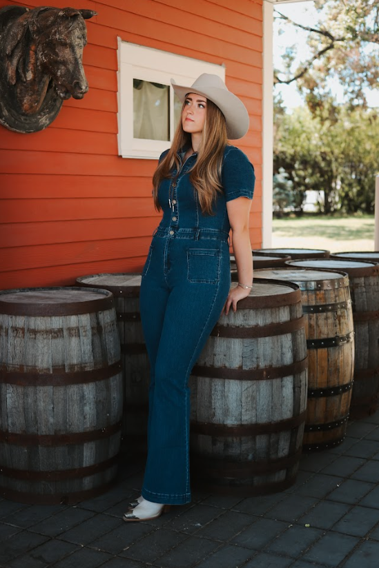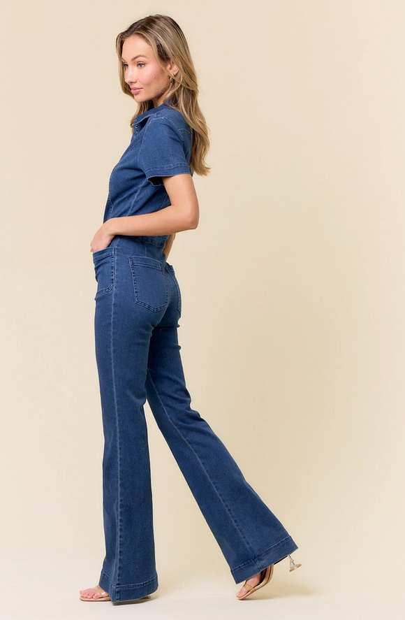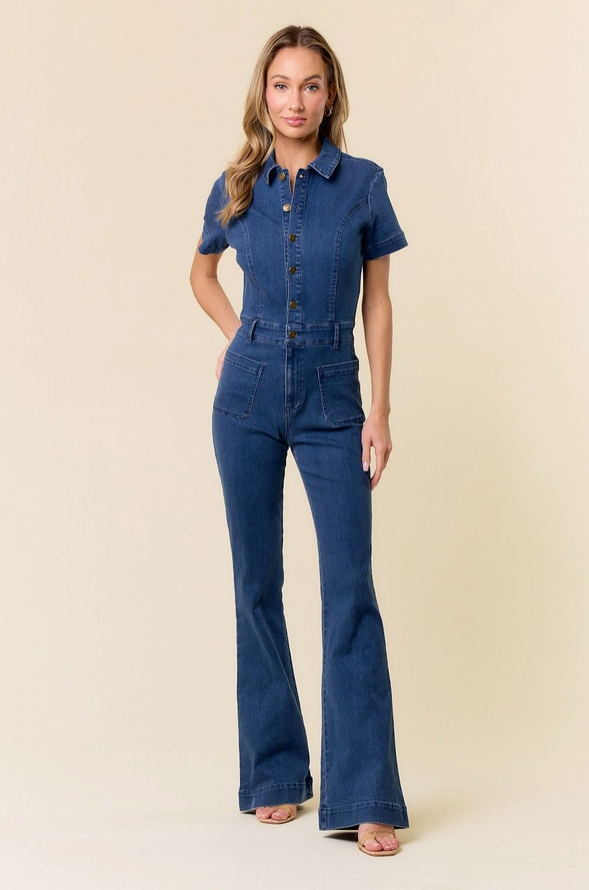 SAINTS & HEARTS Short Sleeve Bootcut Leg Denim Jumpsuit