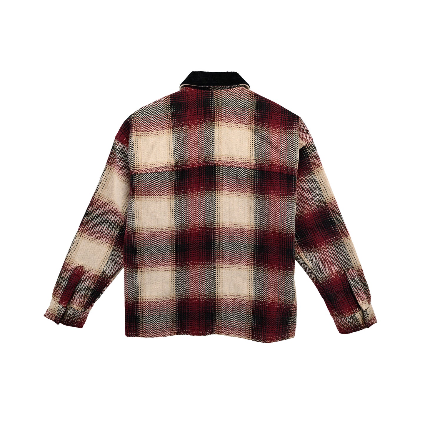 Eye-catching ombre plaid pattern amps up this classic chore jacket while a contrast corduroy collar and pocket flaps add a workwear touch. Soft brushed fabric with a full-length zipper hidden by a functional snap placket at the front.