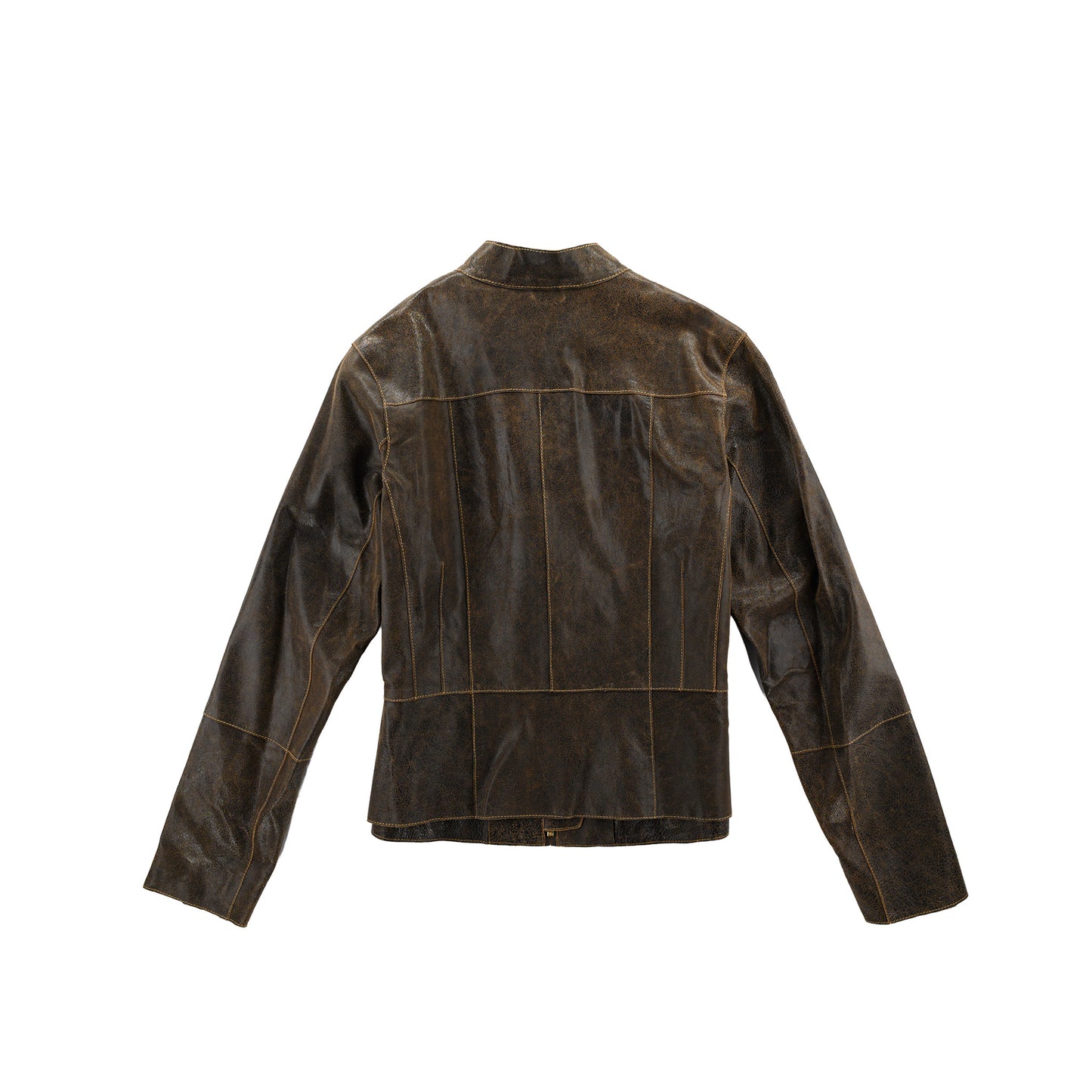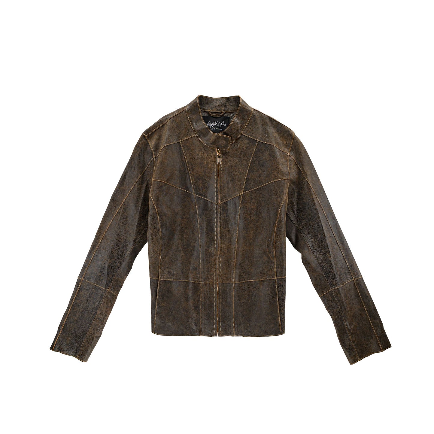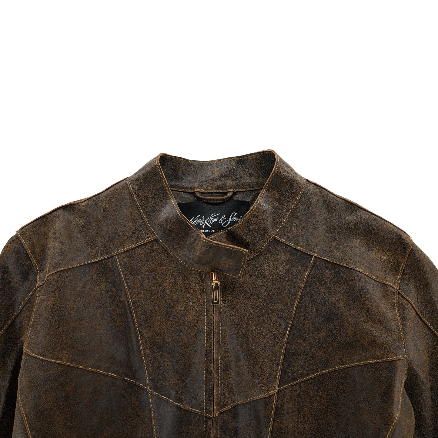 This distressed leather jacket in a rich whiskey tone brings lived-in character with a refined finish. Designed for everyday wear, it pairs effortlessly with denim or tailored pieces,
