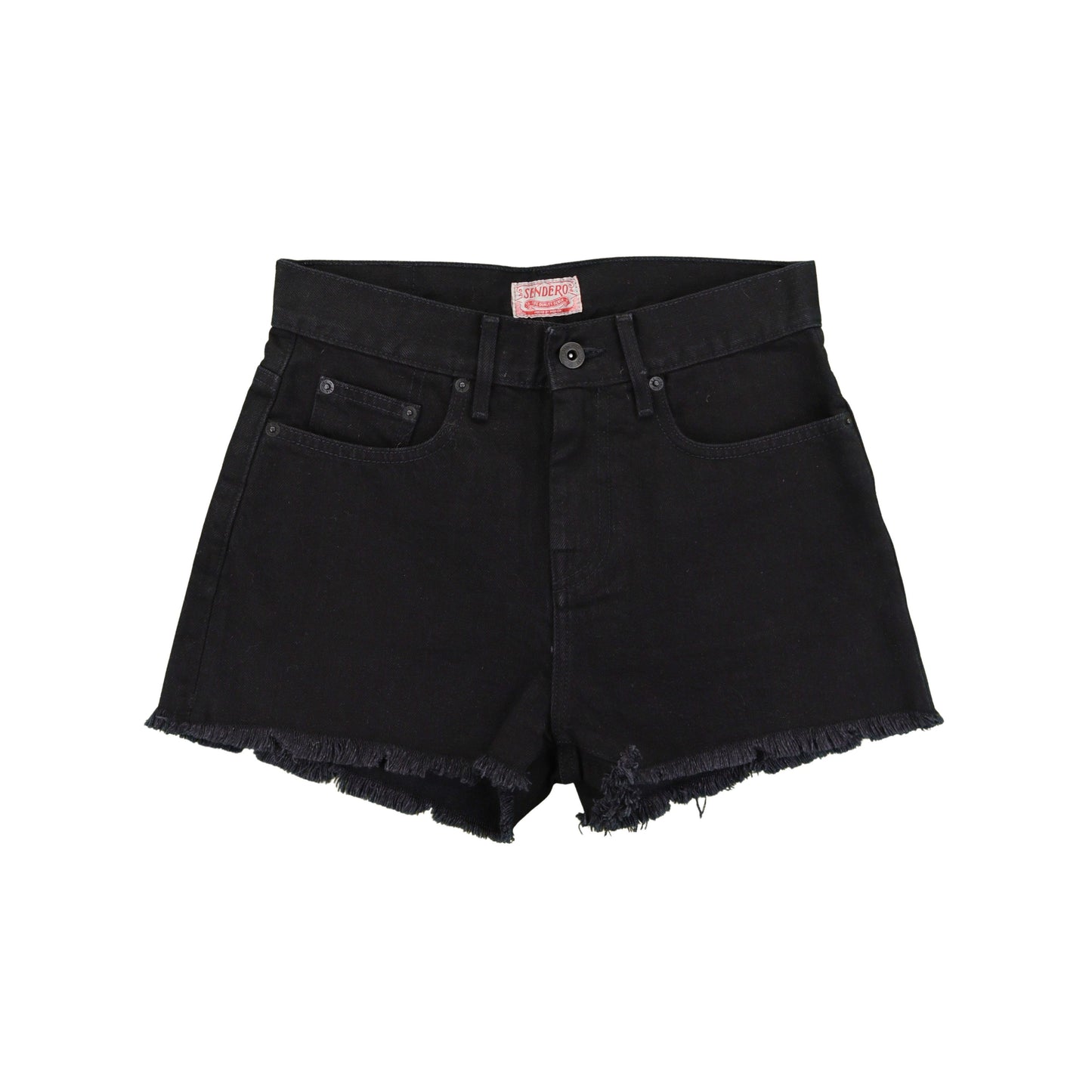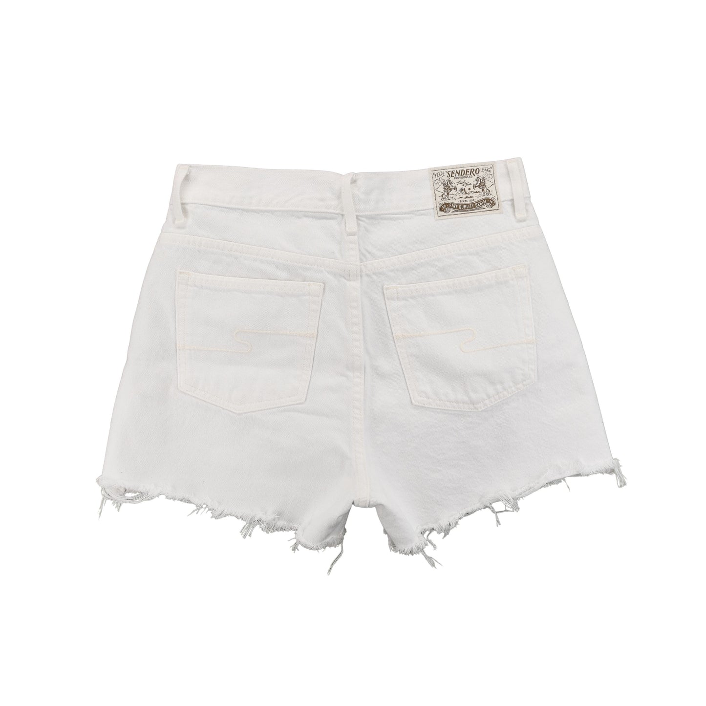 High waisted, easy fitting denim short, with a frayed hem and faded indigo wash. Classic Sendero denim packaging, including custom shanks and rivets, pocket bag print, main and size labels, and a printed paper back patch.