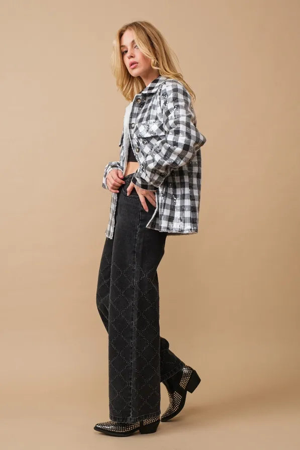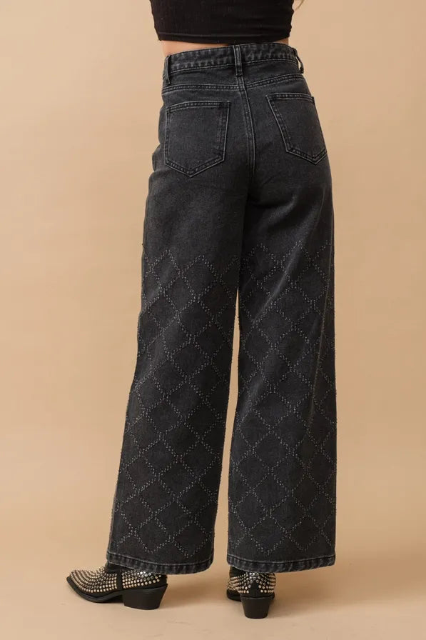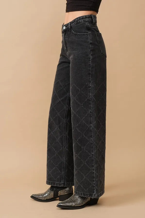 BLUE B Distressed Quilted Slash Wide Leg Mid Rise Denim Jeans