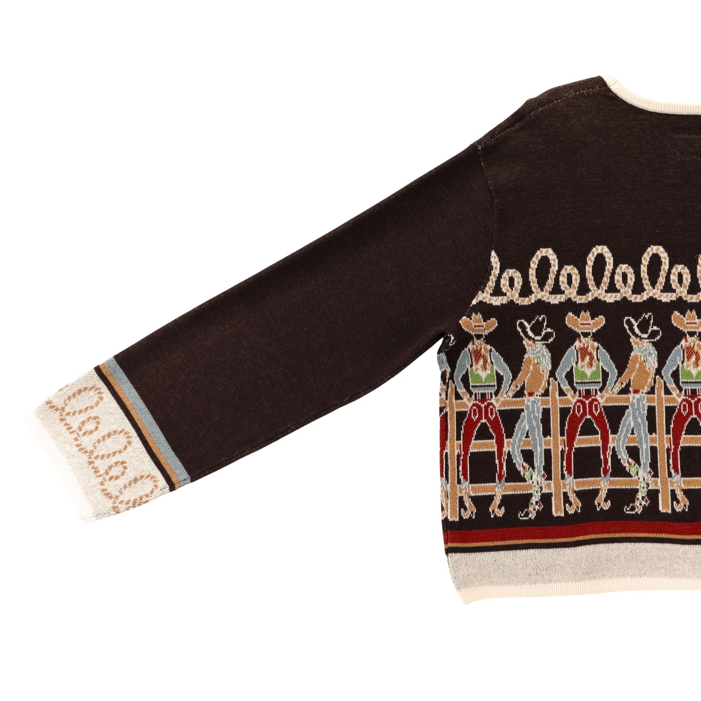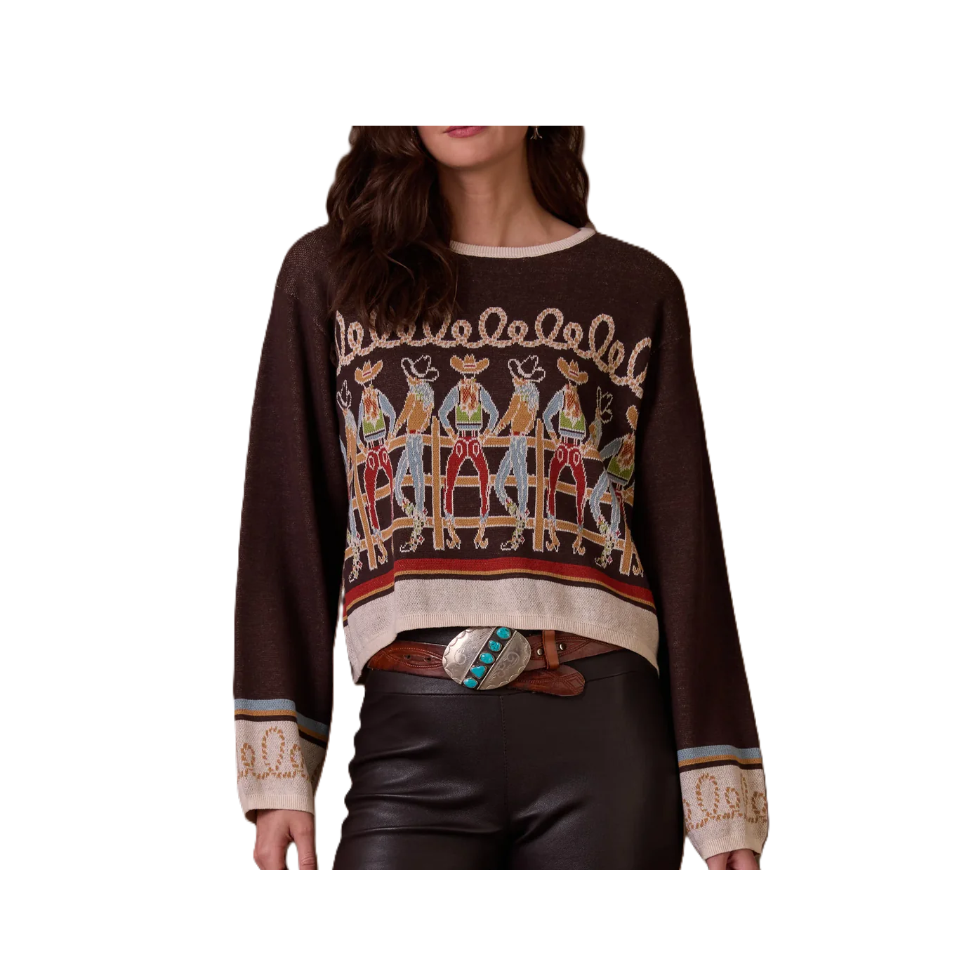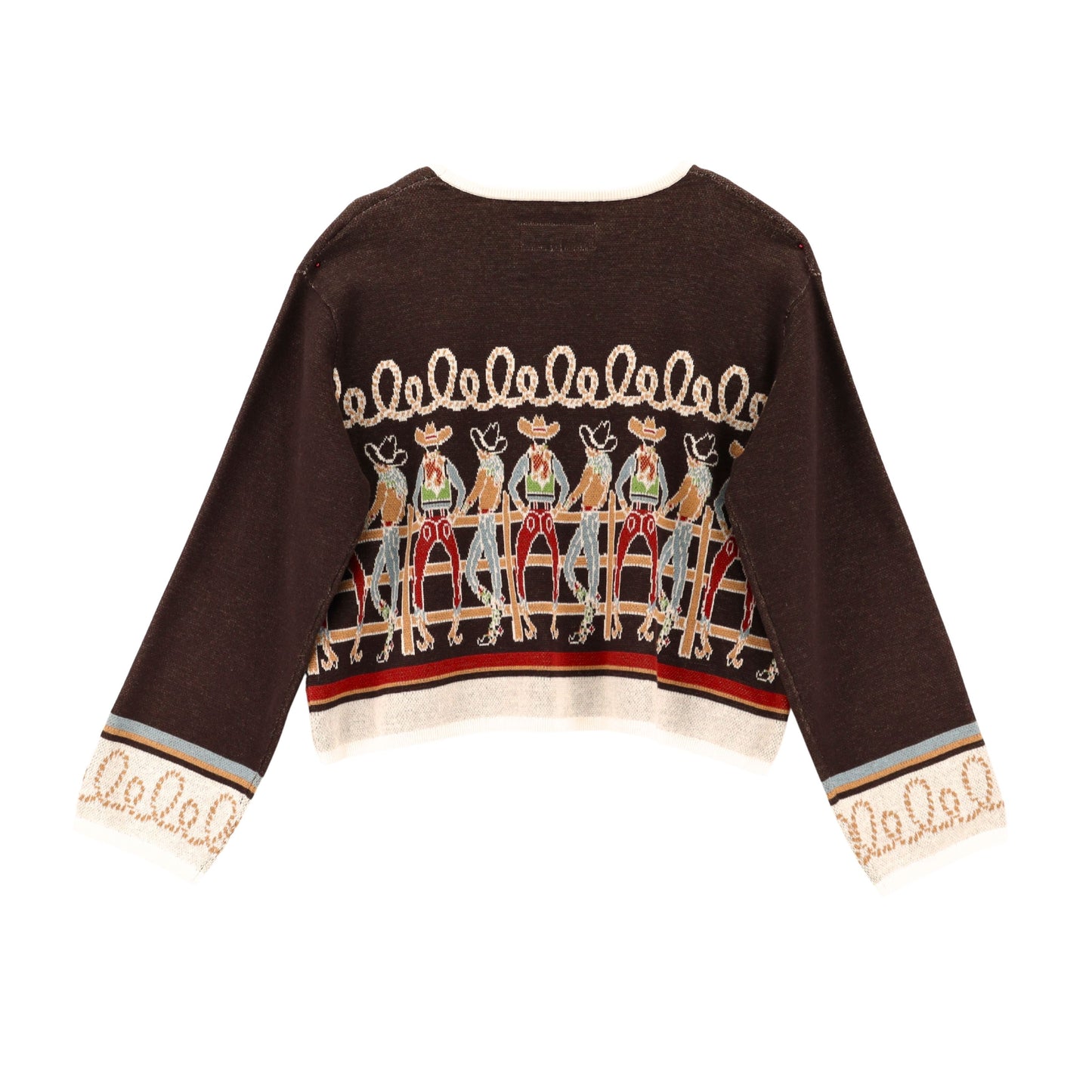 Cowboy characters, colourful charm, and a touch of twang - this bronco brown cotton crop is full of personality! Rope-inspired accents and contrasting cuffs and collar make it pop, while the relaxed, boxy fit and cropped length keep it effortlessly playful.