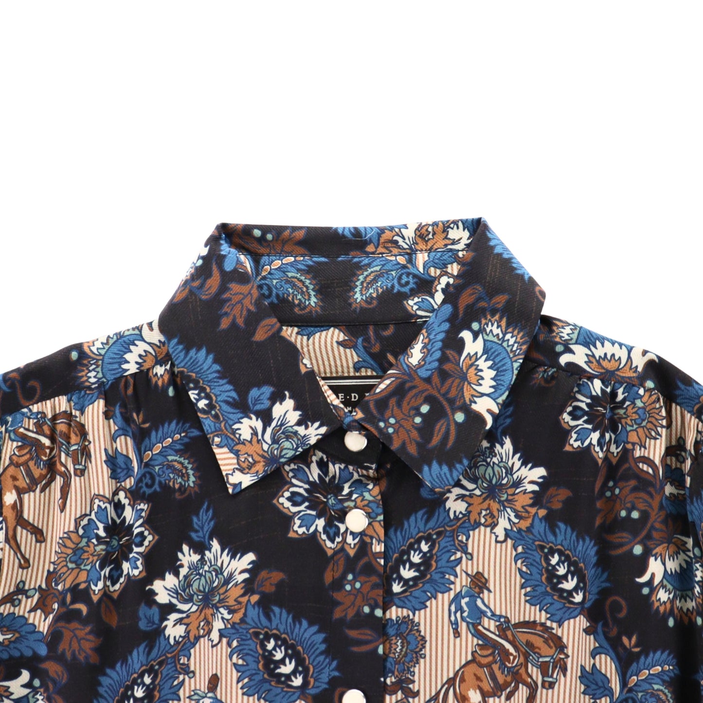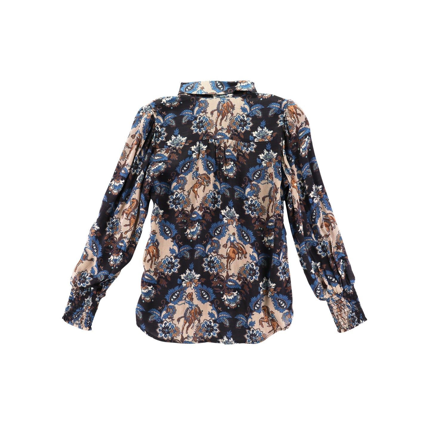 Who says button-downs can’t be swoon-worthy? This viscose top pairs a dreamy damask custom print with a contrasting pearl snap placket and smocked cuffs for a look that’s both chic and effortless. Classic fitted body and full sleeves make it easy to dress up or wear every day.