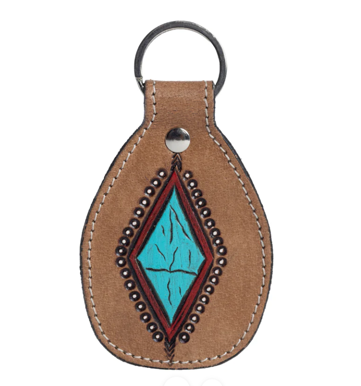 A beautiful tribal-inspired symbol, lovingly colored in turquoise and red, adorns this alluring leather key fob. A strikingly beautiful accessory for anyone!