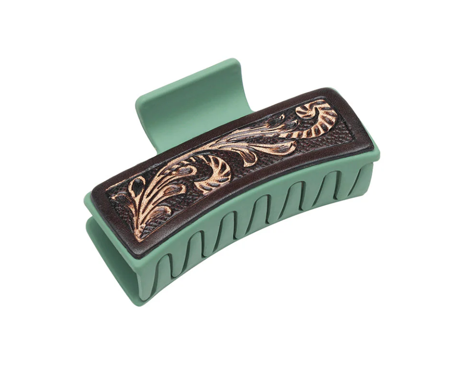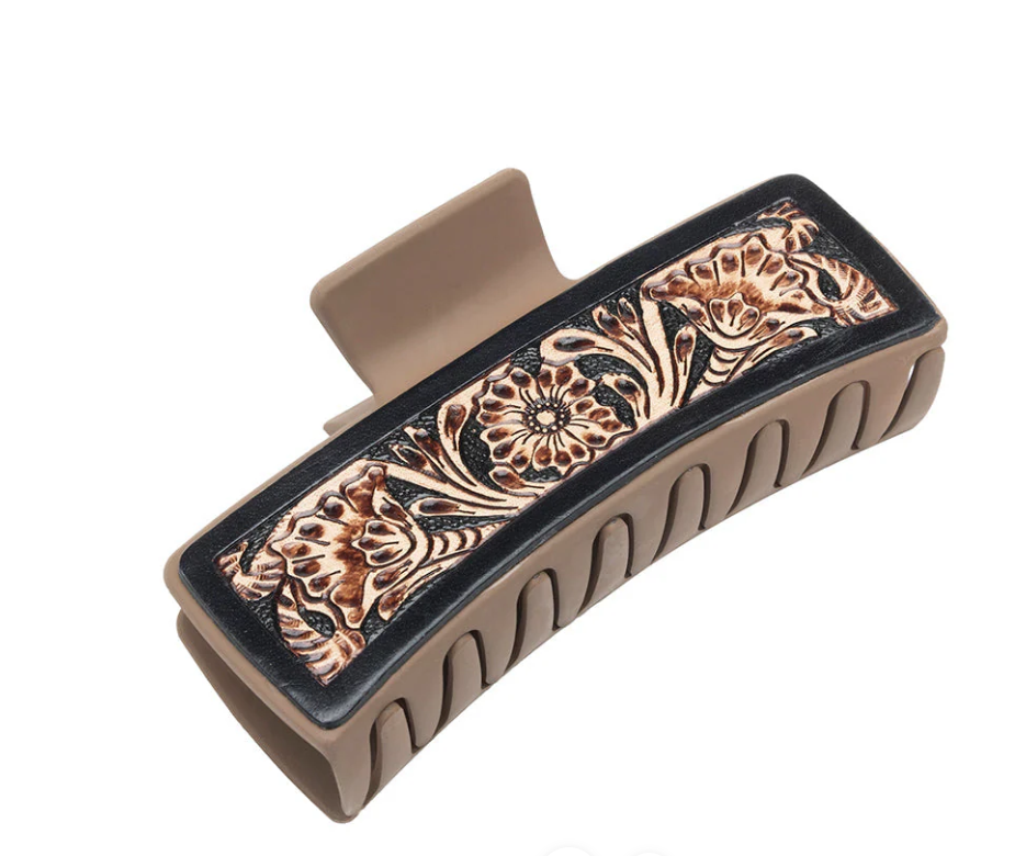 You'll love this great hair clip, which offers great form and function. The comb holds securely, with a comfort-wave design (no sharp teeth!). It's in a delightful dark dusty rose color, and you have a wonderful set of choices for a unique and decorative accent: • Hand-Tooled Leather • Black and White Hair-on Hide • Brown and White Hair-on Hide • Brown Embossed Leather