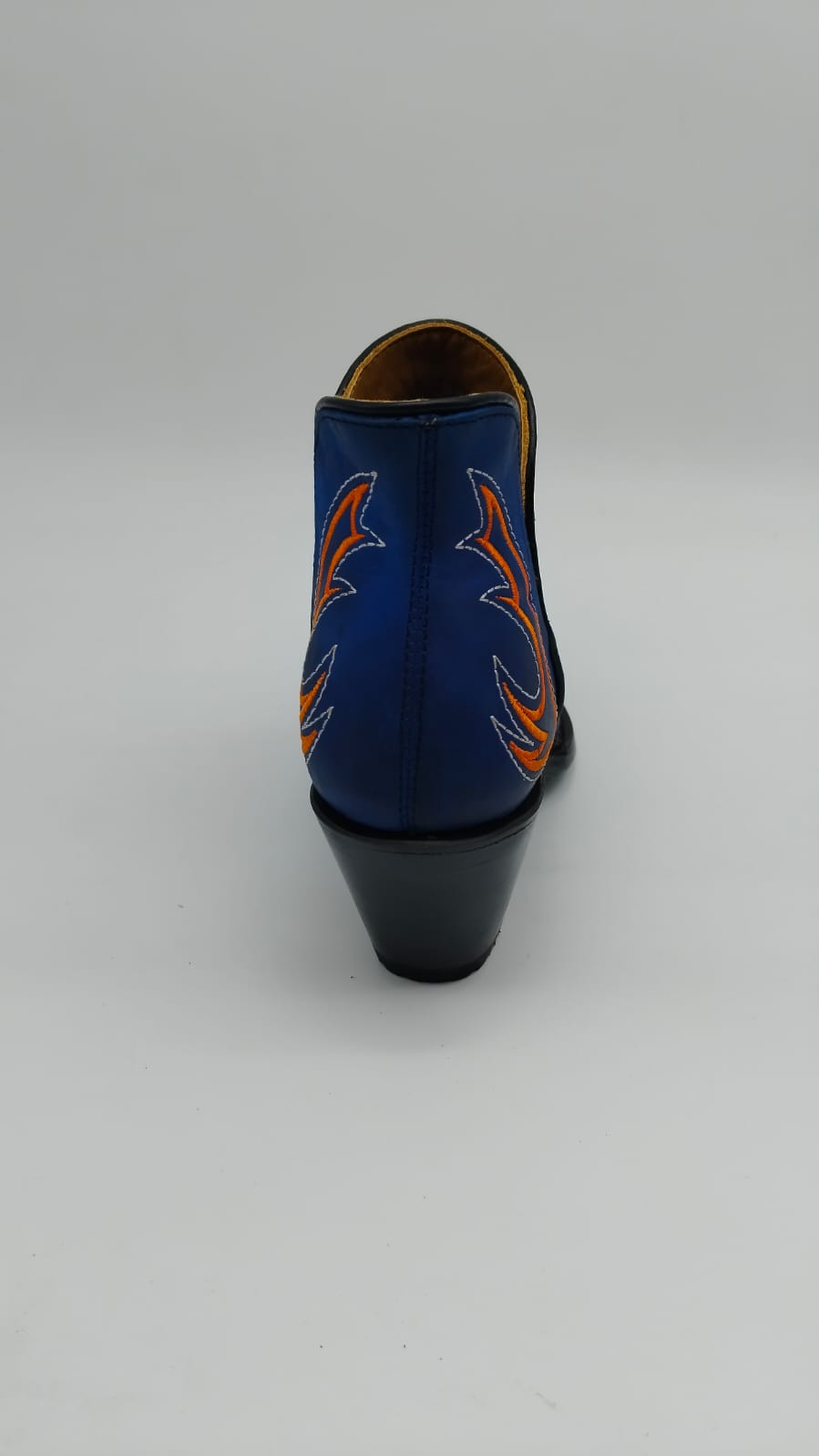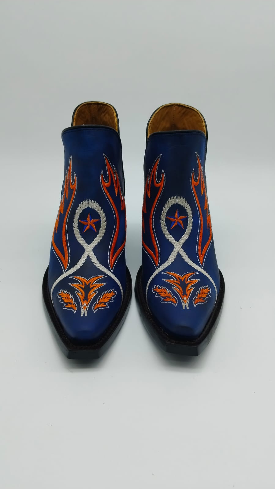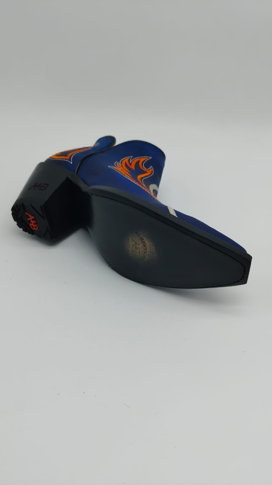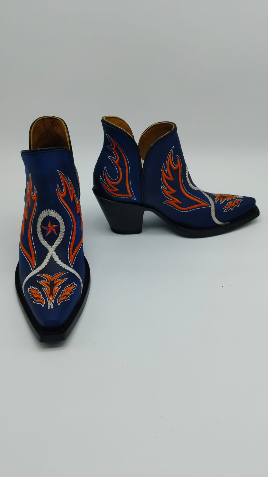 C.C. is fearless by design. Inspired by the first woman to compete against men, this boot channels rodeo energy at full throttle. A bold Lone Star takes centre stage, framed by dynamic lasso embroidery that captures movement, courage, and grit. Crafted in rich blue cowhide leather with vibrant orange and gold stitching inspired by the colours of the Houston Livestock Show and Rodeo, the palette mirrors the electricity of a night at the rodeo. A subtle wheat detail at the toe grounds the boot in agriculture and Houston heritage. Strong, unapologetic, and built to break barriers, just like the woman it honours.