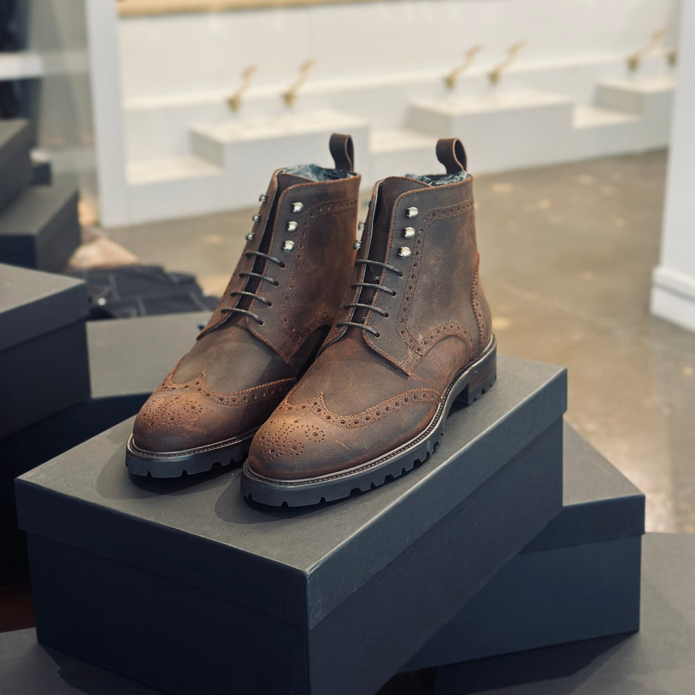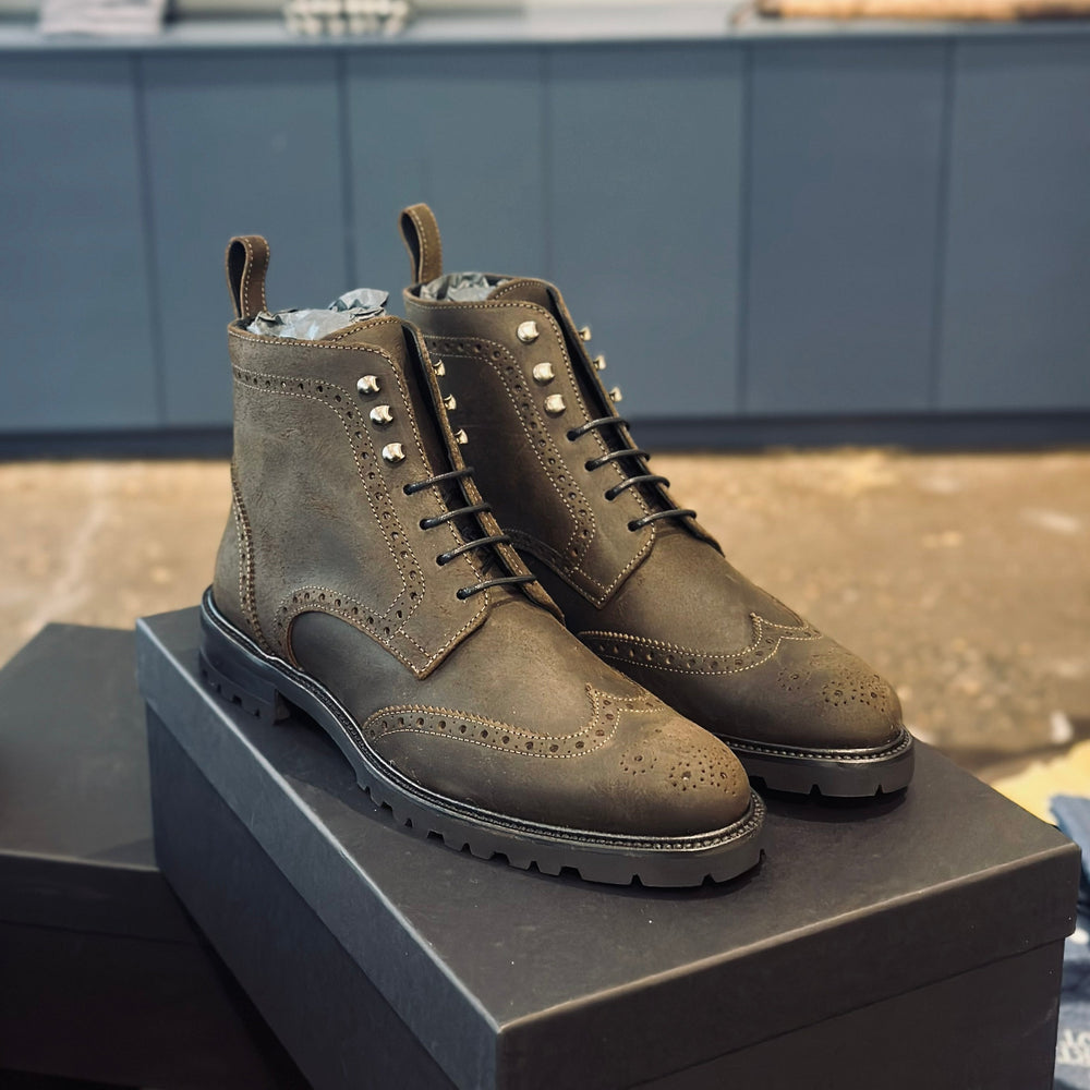 Available in the rich, earthy hues of Olive and Brown, these boots are crafted to perfection, marrying the rugged allure of waxed suede with the refined touch of a lace-up design. The result of a partnership that values quality and innovation, these boots embody the essence of adventure and sophistication.